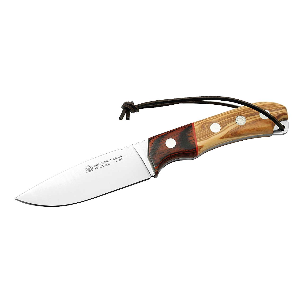 Das Palma Olive aus dem Hause Puma ist ein kleines und dennoch besonders praktisches Alltags-Outdoor Messer, welches sowohl für das Bushcraften, als auch für das Jagen verwendet werden kann. Die Klinge ist dank dem rostfreien 1.4116 Stahl besonders stabil und weist eine Härte von 55-57 HRC auf. Dank der Vollerl-Ausführung hält das Messer auch größere Belastungen problemlos aus. Die Heftschalen sind aus gemasertem Olivenholz und sind im vorderen Bereich mit Pakkaholz kombiniert, was für eine sehr schöne Optik sorgt. Der Griff selbst ist ergonomisch geformt und liegt sehr gut in der Hand. Einen sicheren Transport ermöglicht die im Lieferumfang beiliegende Sattellederscheide.