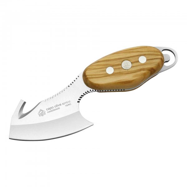 Das PUMA IP Capo Olivev ist ein perfekter Begleiter für all diejenigen, die für die Jagd ein praktisches, handliches und vor allem kompaktes Werkzeug suchen. Das Capo ist durch seine Form ideal als Skinner-Messer geeignet. Die Klinge besitzt einen praktischen Aufreißhaken und kann dank der Riffelung und der Griffform präzise und sauber geführt werden. Die Klinge besteht aus einem rostfreien AN.58 Stahl und ist in Full Tang Bauweise ausgeführt. Im Lieferumfang enthalten ist eine praktische Lederscheide. Durch das geringe Gewicht und die kompakte Größe lässt es sich also sehr gut auf jeden Jagdeinsatz mitnehmen.