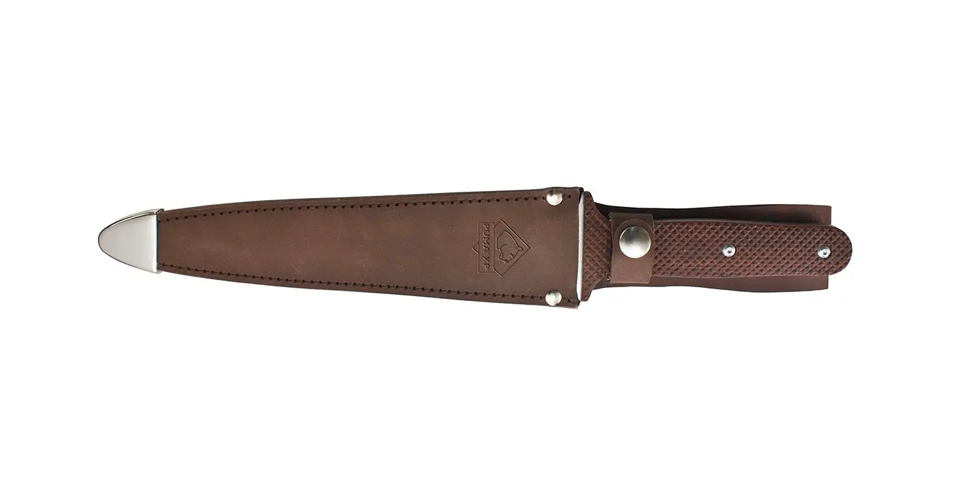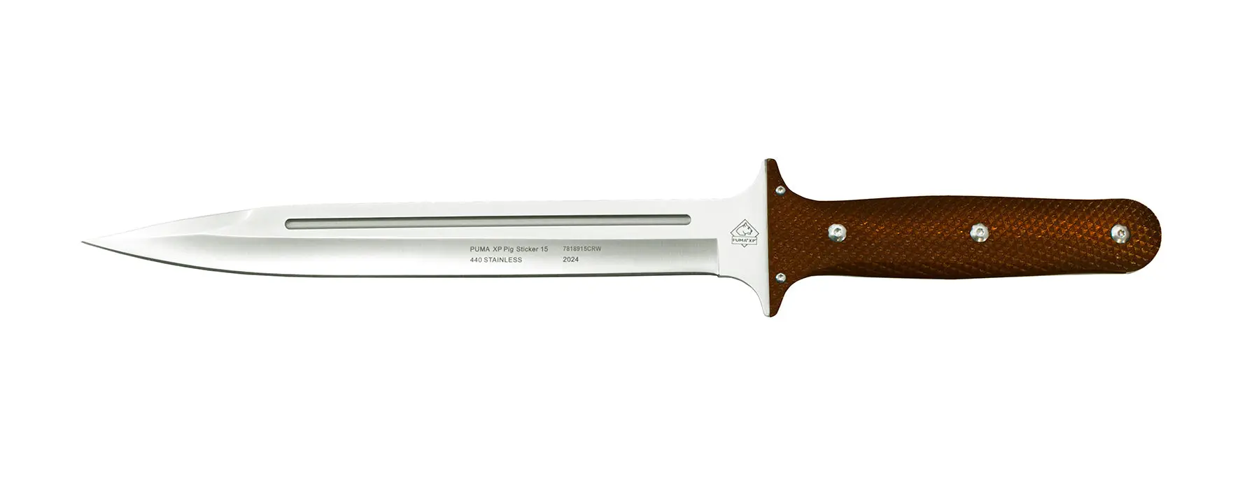 Ein praxistaugliches Abfangmesser ist bei der Jagd auf Schwarzwild schon seit jeher fester Bestandteil der waidmännischen Ausrüstung. Das Modell „pig sticker 15“ aus unserer amerikanischen XP-Serie ist mit seiner knapp 25 cm langen, satinierten Klinge nicht nur funktional, sondern auch optisch ein Hingucker. Der Griff mit integralem Parierelement ist symmetrisch geformt und trägt schöne Schalen aus braunem Pakkaholz, das mit einer griffigen Fischhautverschneidung versehen ist. Das Messer besitzt eine durchgehende Fulltangkonstruktion aus einem Stück 440-Stahl, gehärtet auf 55-57 HRC und ist daher sehr stabil. Als spezifisches Merkmal weist die mittelspitze Klinge im Ortbereich eine angeschliffene Phase sowie an den Flanken eine beidseitige Hohlkehle auf. Die Klinge ist nicht beidseitig geschliffen. Unser „PUMA XP pig sticker“ ist auch bestens für die Nachsuche geeignet und wird mit einer sehr hochwertigen, paßgenauen Lederscheide mit Gürtelschlaufe ausgeliefert.