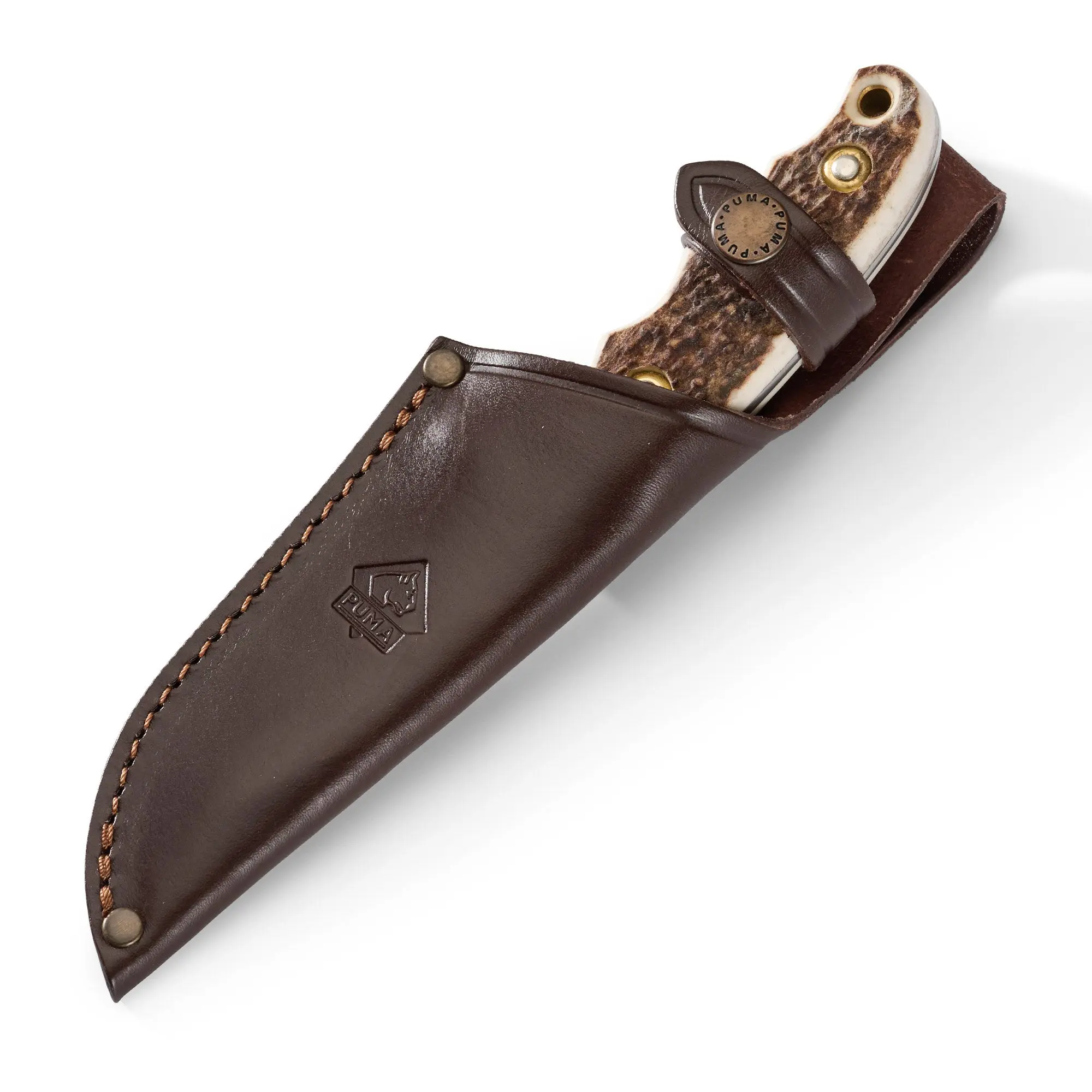 Für die Griffbeschalung wurde Hirschhorn gewählt. Dank der ausgeprägten Fingermulden in Kombination mit dem kräftigen Knebel aus Neusilber ergibt sich ein sicherer Halt beim Arbeiten mit diesem hochwertigen PUMA-Messer.