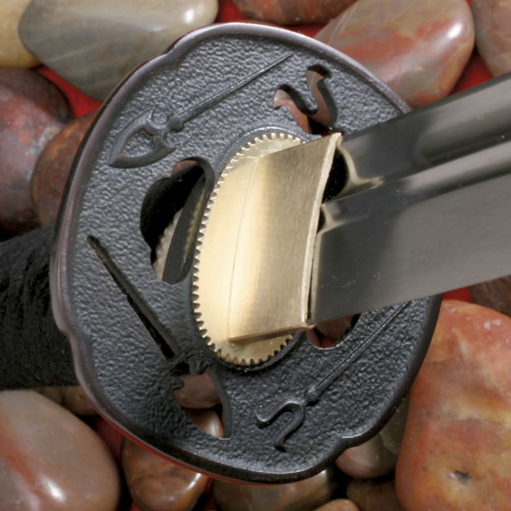 - Griff aus Samé (Rochenhaut) mit schwarzer geflochtener Kordel und Menuki aus Messing.