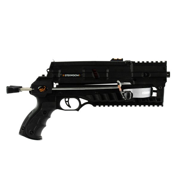 Die AR-6 Stinger II Compact ist eine leichte und kompakte Pistolenarmbrust mit einem 6-schüssigen Magazin. Die Compact-Variante ist kompatibel mit allen anderen AR-6 Stinger II Varianten und kann mit entsprechendem Zubehör vielfältig umgebaut werden. Diese neue Armbrust wurde speziell auf den Repetiermechanismus der Stinger ausgelegt. Der Zugbügel erlaubt nicht nur eine Handhabung wie bei einer Pistole sondern auch das Zielen während des Repetierens. So können mehrere, genaue Treffer noch schneller erfolgen. Hergestellt aus hochwertigem Polymer, damit extrem robust, sehr zuverlässig und durch die präzise Fertigung auf Distanzen bis 25 Meter zielgenau. Das direkt übersetzte Spannsystem benötigt zwar beim Spannen mehr Kraftaufwand als bei der Tactical Variante, dafür sind aber deutlich schnellere Schussfolgen möglich. Der verbaute Glas-Carbon Wurfarm mit einem Zuggewicht von 35 lbs ist sehr effizient und erreicht trotz des relativ geringen Zuggewichts eine erstaunlich hohe Energie von 10 Joule und das ist genau so viel wie die meisten Pistolenarmbrüste erst mit 80 lbs erreichen.